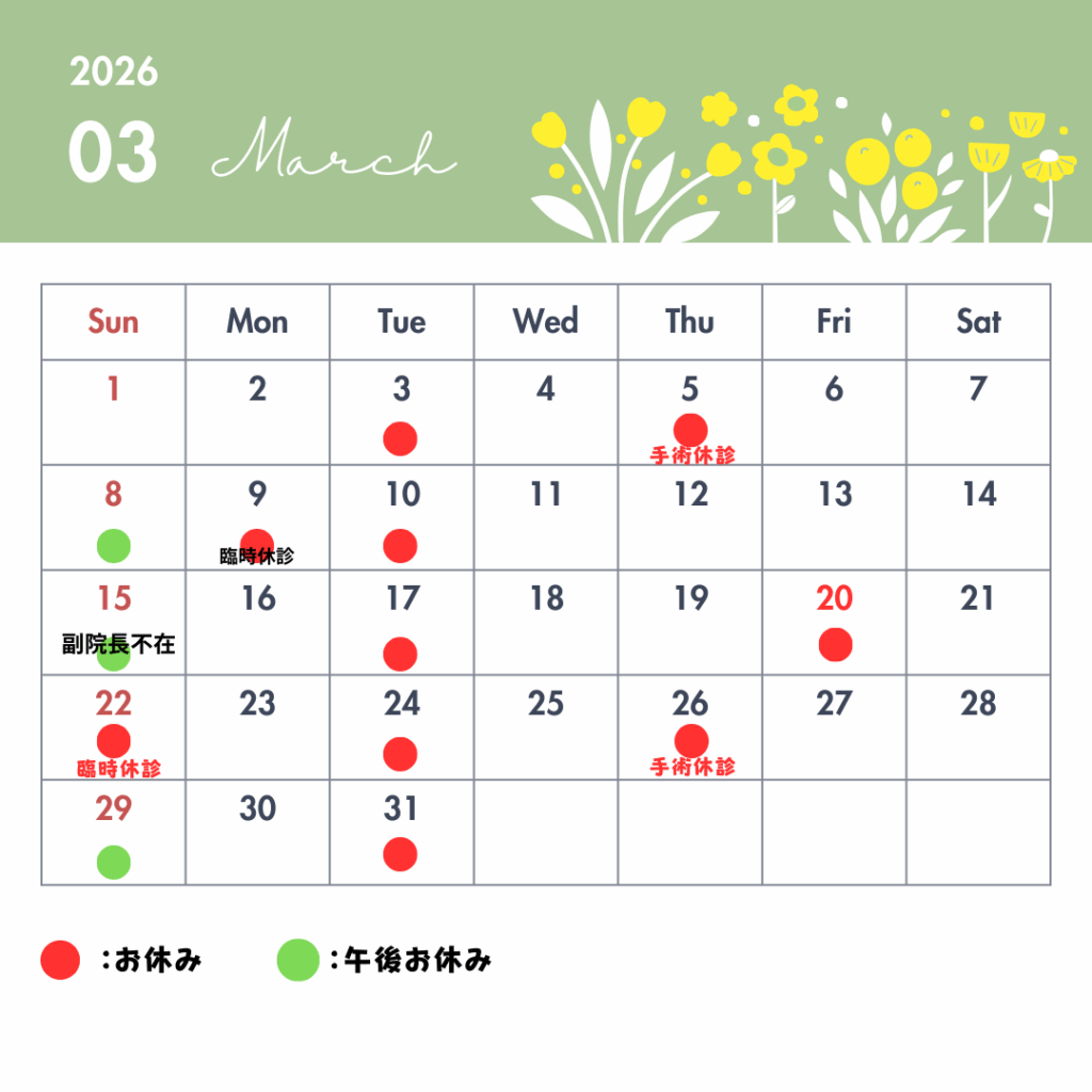 【3月のお知らせ】 ①3月から木曜日が手術休診日となる日があります。(該当日は5日と26日) 午前…続きを読む