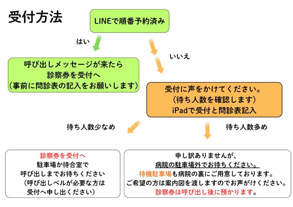 LINEかご来院の上で受付を行ってください。