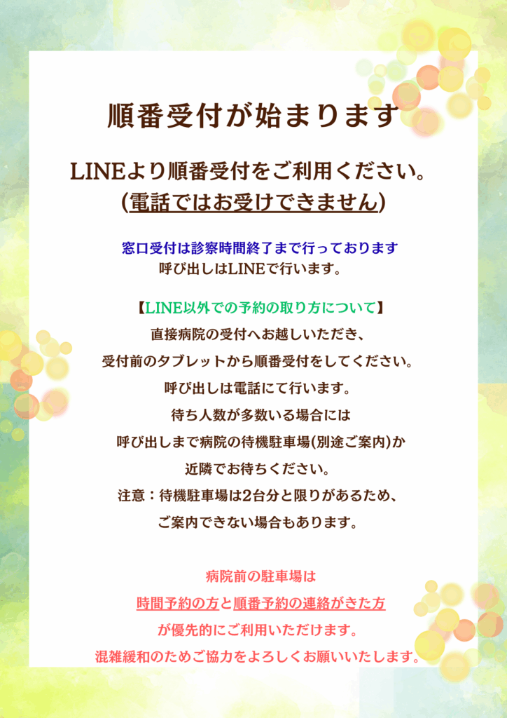 *電話での順番予約は受け入れておりません。